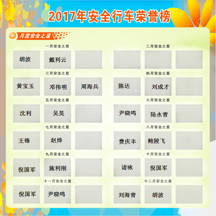 2017年的月度安全之星,并有4位员工多次上榜,他们分别是一部试车员倪国军、尹晓鸣、胡波,三部试车员陈龙。